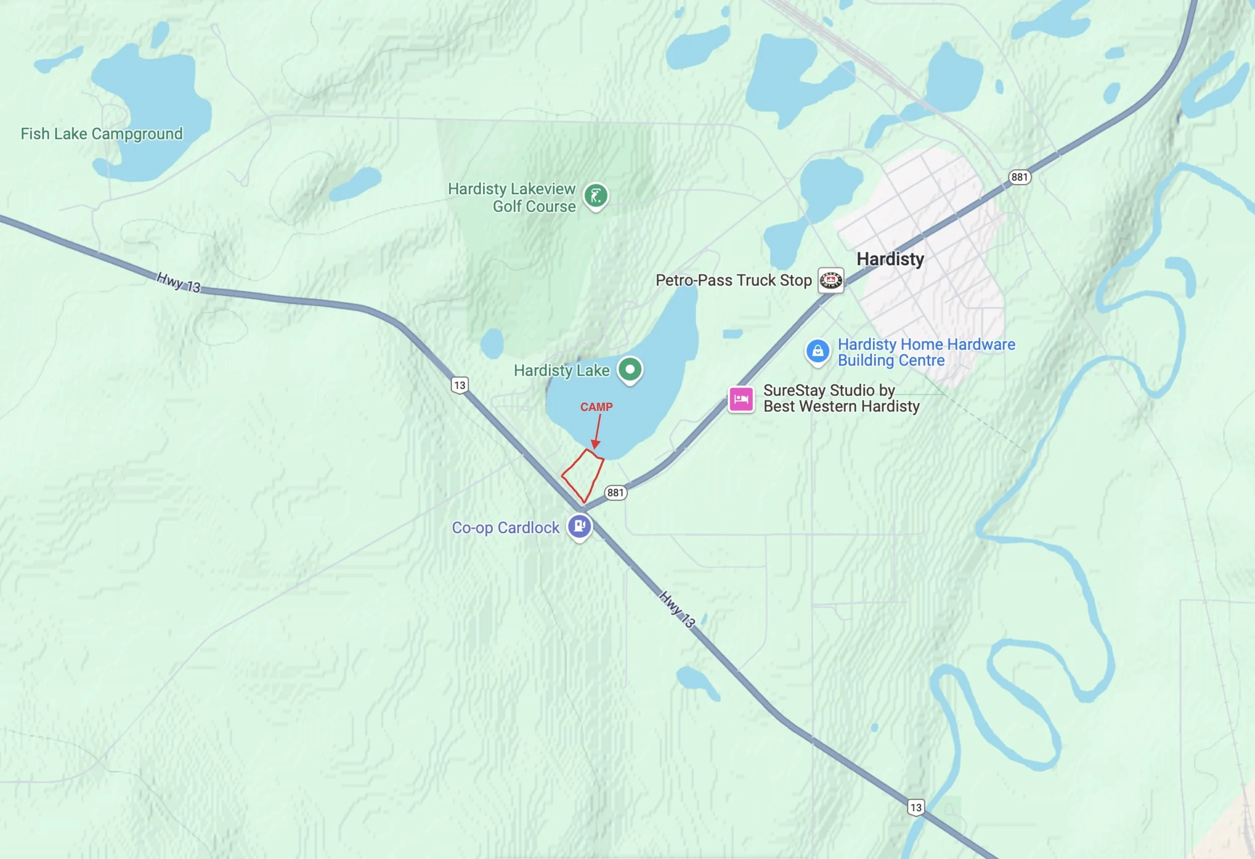 Our camp is nestled in the forest along the shores of Hardesty Lake. If you are driving on Highway 13, turn north onto 49th St (towards Hardisty HWY 881) then take an immediate left down the dirt road. Our camp is the first driveway on your right